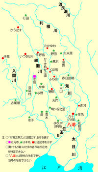 この「市場之祭文」とは、市を開くにあたって神前で読み上げられた祭文であり、末尾には武蔵東部から下総〔しもうさ〕西部の地に所在した33か所の市場が挙げられており、八十市もそのひとつである。
