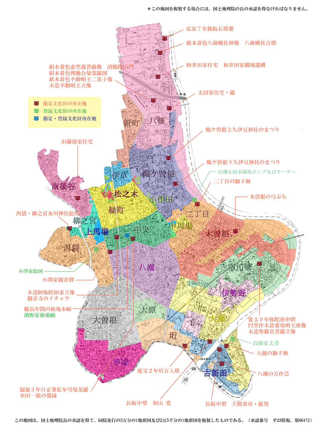 - 『れきナビ―やしお歴史事典』:旧版:指定・登録文化財マップ(現在)(20150723版)