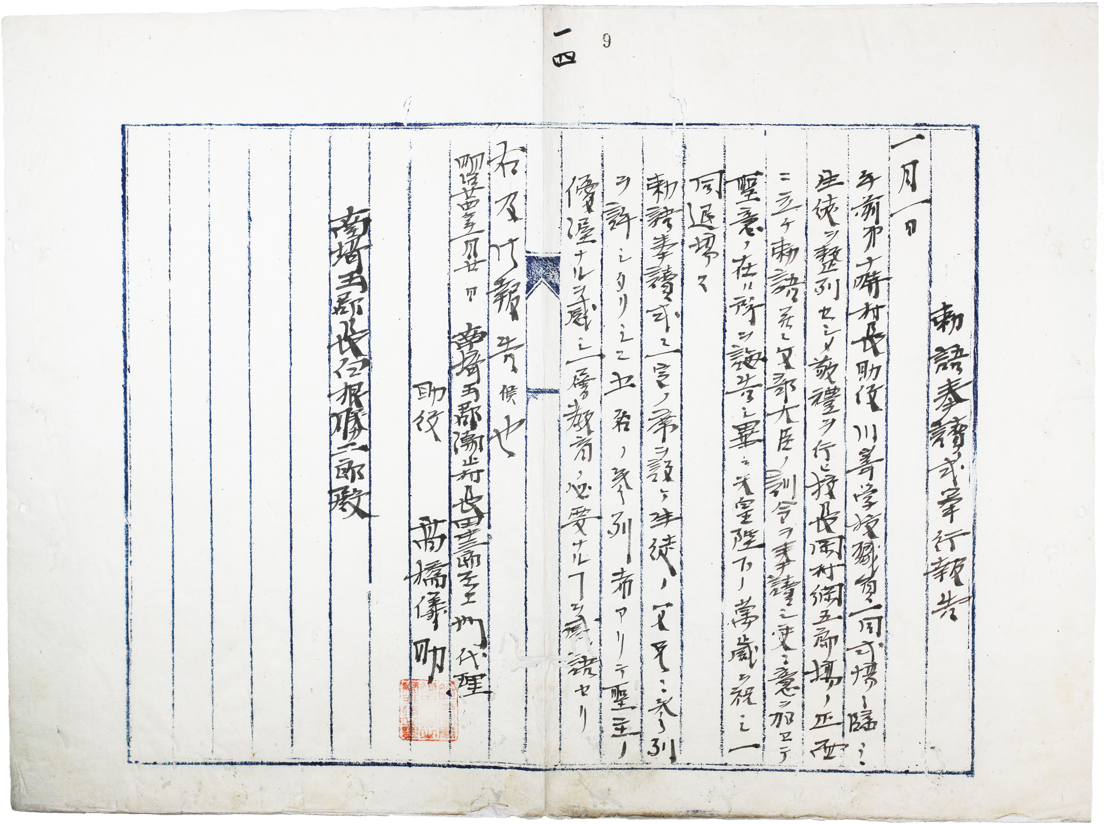 - 出典:八潮市立資料館所蔵 公文書5199 「学務 雑事 報告往復文書」 9 「勅語奉読式挙行報告」/資料館撮影