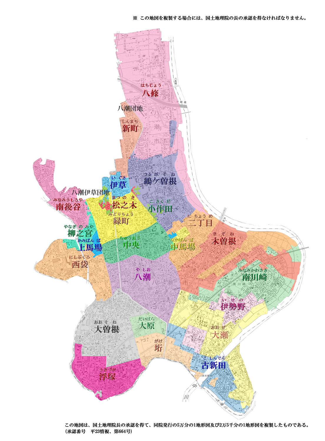 - 『れきナビ―やしお歴史事典』:旧版:大字・町名マップ(現在)(20141003版)