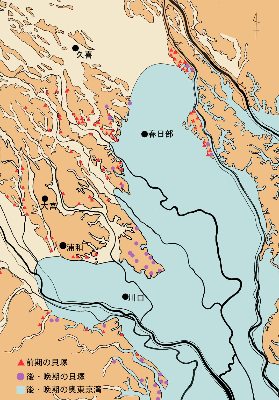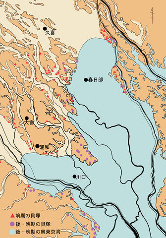 - タイトル:縄文時代後・晩期の奥東京湾と貝塚図