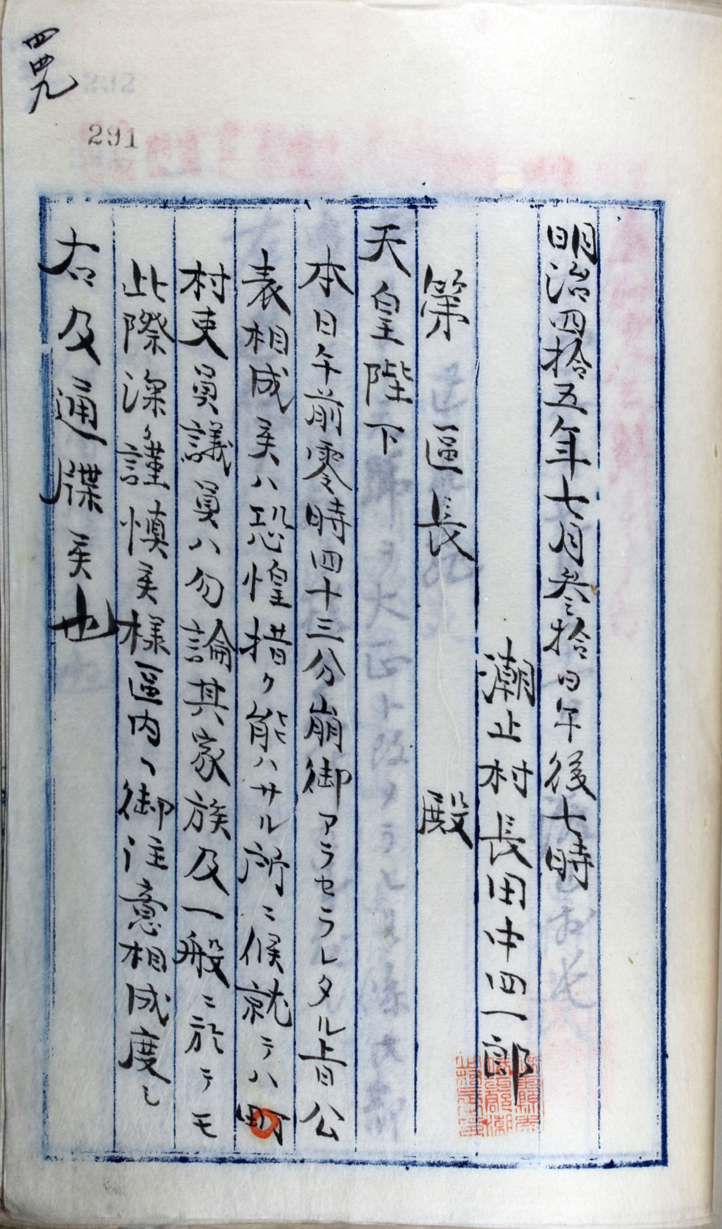 - 出典:八潮市立資料館所蔵 公文書5595 「庶務部 報告往復 県郡報告事項往復書」 291/資料館撮影