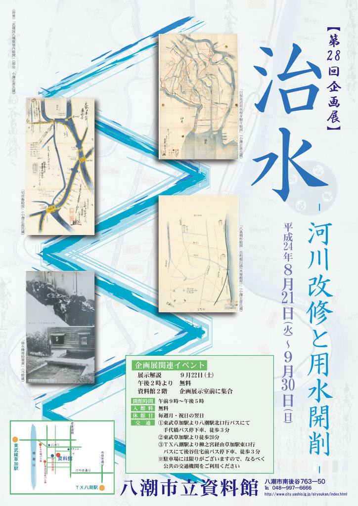 - タイトル:八潮市立資料館第28回企画展「治水―河川改修と用水開削―」ポスター