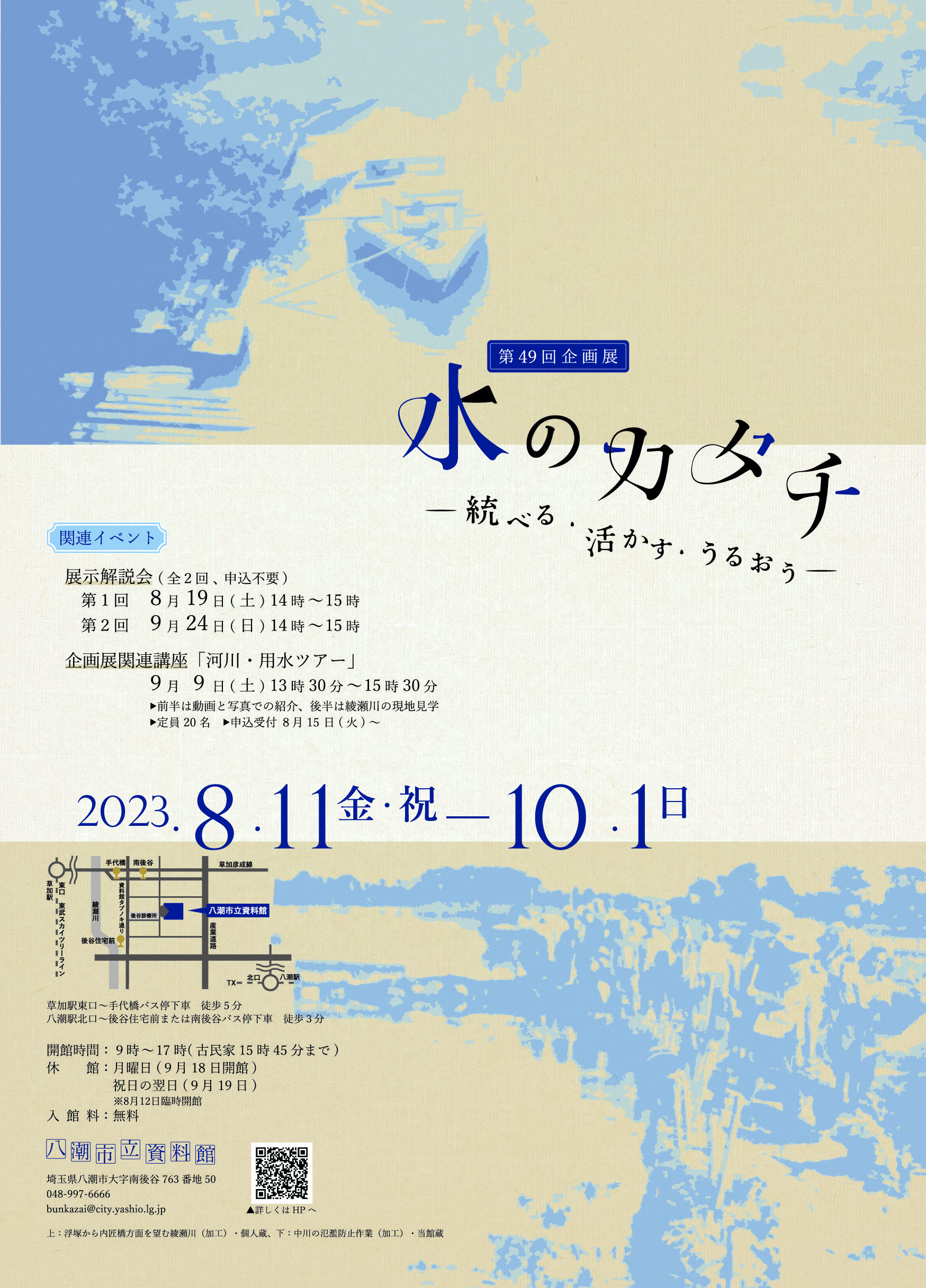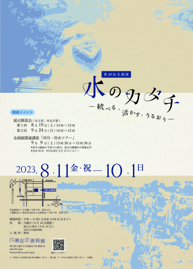 - タイトル:八潮市立資料館第49回企画展「水のカタチ―統べる・活〔い〕かす・うるおう―」ポスター