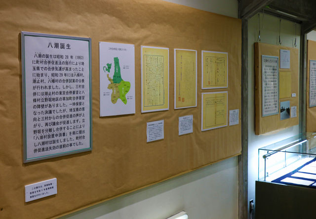 - タイトル:令和5年度(2023年度)博物館実習展示(「八潮誕生」ほか)展示風景(八潮市立資料館通路展示)