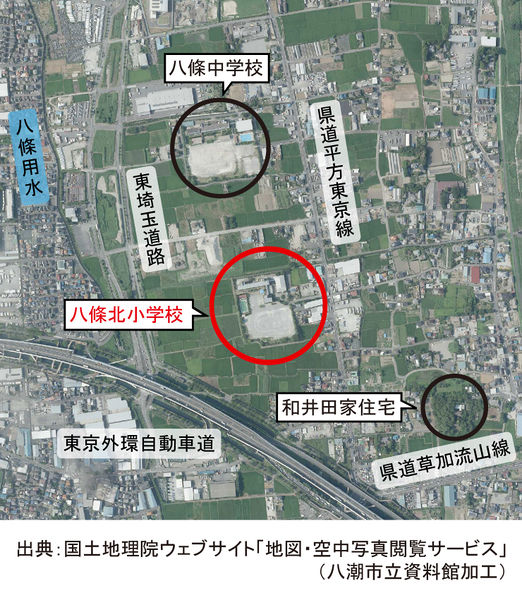 - 出典:国土地理院撮影空中写真CKT20192-C7-29(国土地理院ホームページ「地図・空中写真閲覧サービス」より転載)/八潮市立資料館加工
