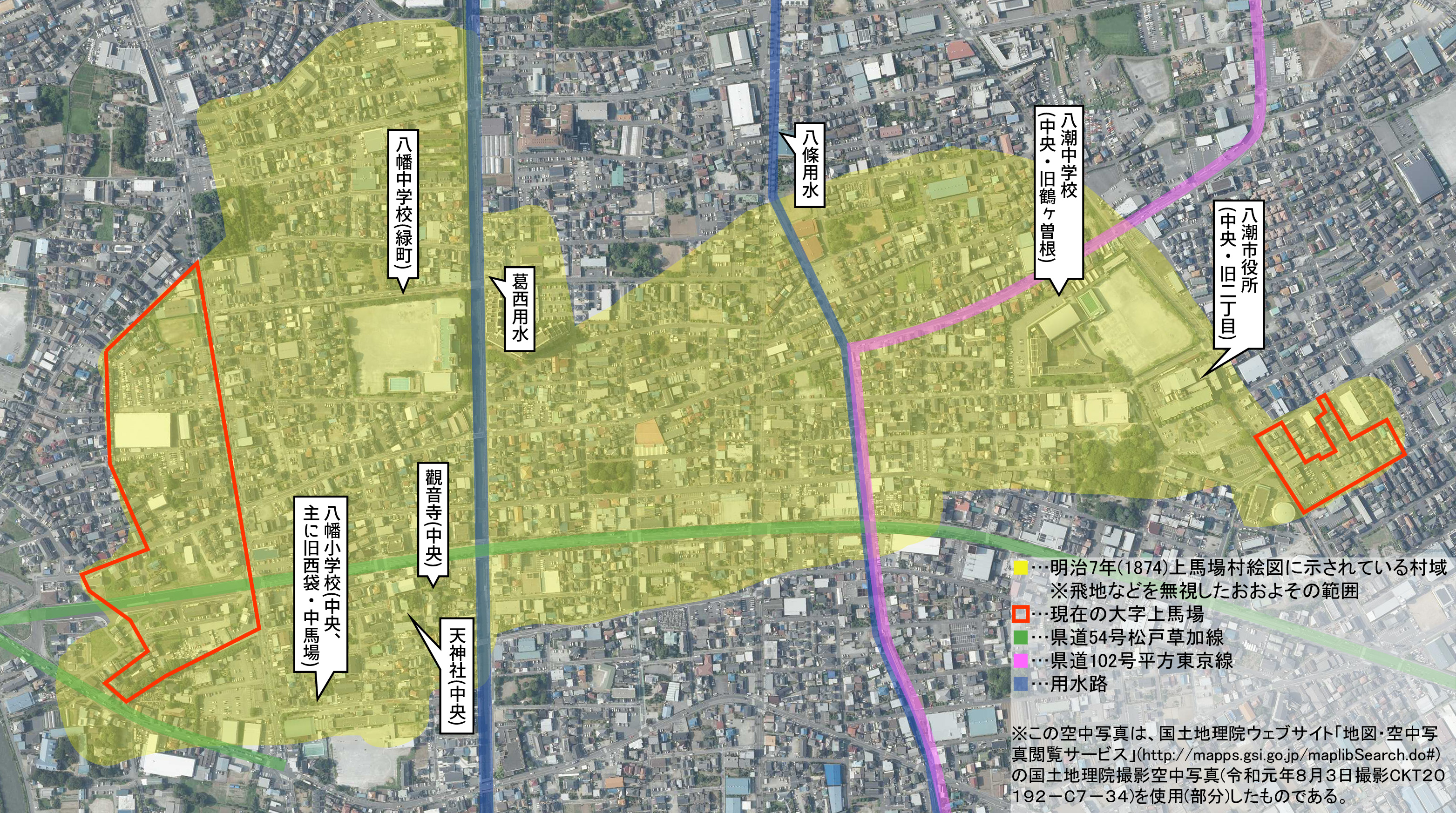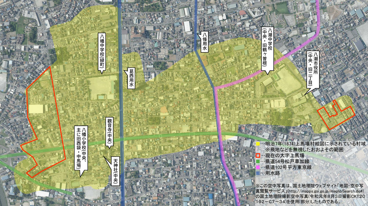 - 出典:国土地理院撮影空中写真CKT20192-C7-34(国土地理院ホームページ「地図・空中写真閲覧サービス」より転載)/八潮市立資料館加工
