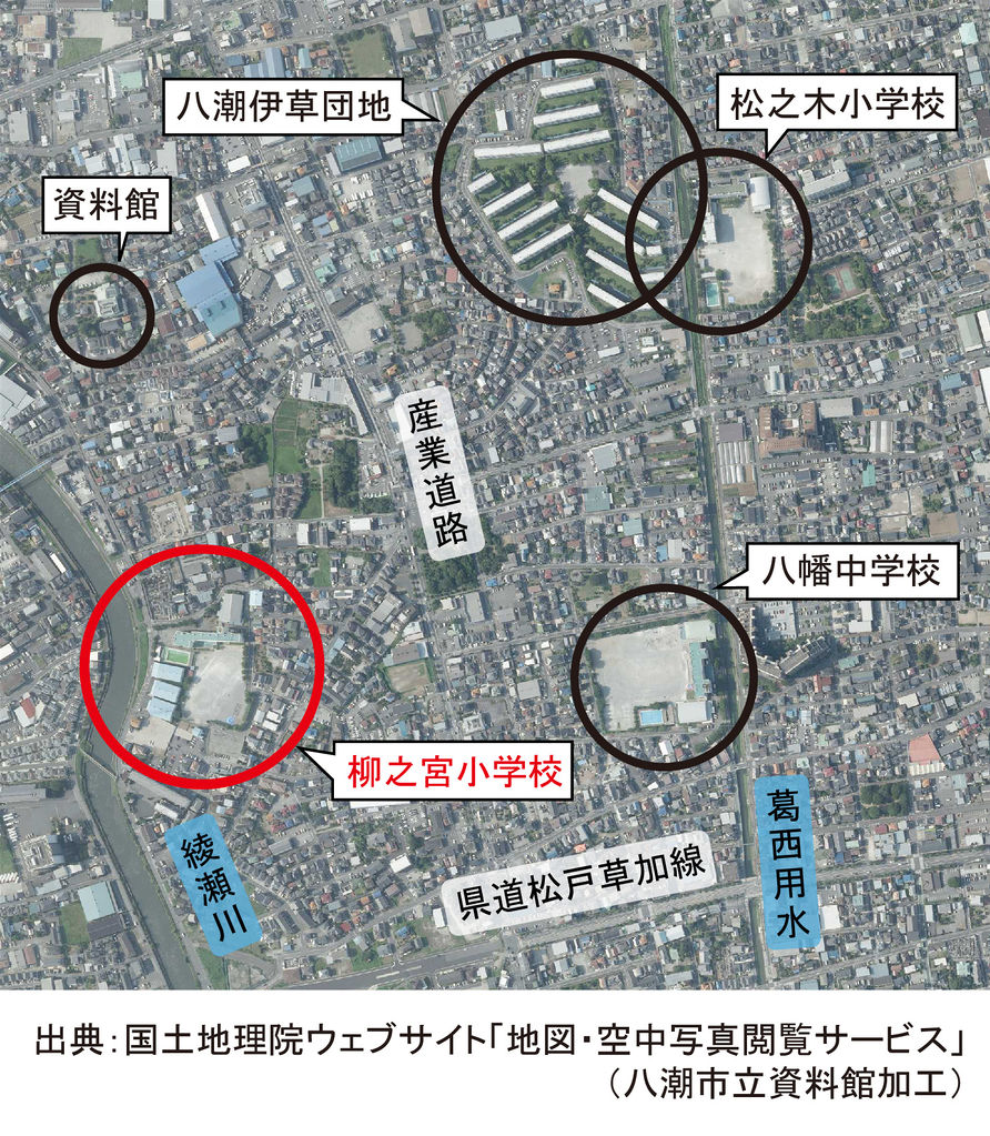 - 出典:国土地理院撮影空中写真CKT20192-C7-34(国土地理院ホームページ「地図・空中写真閲覧サービス」より転載)/八潮市立資料館加工
