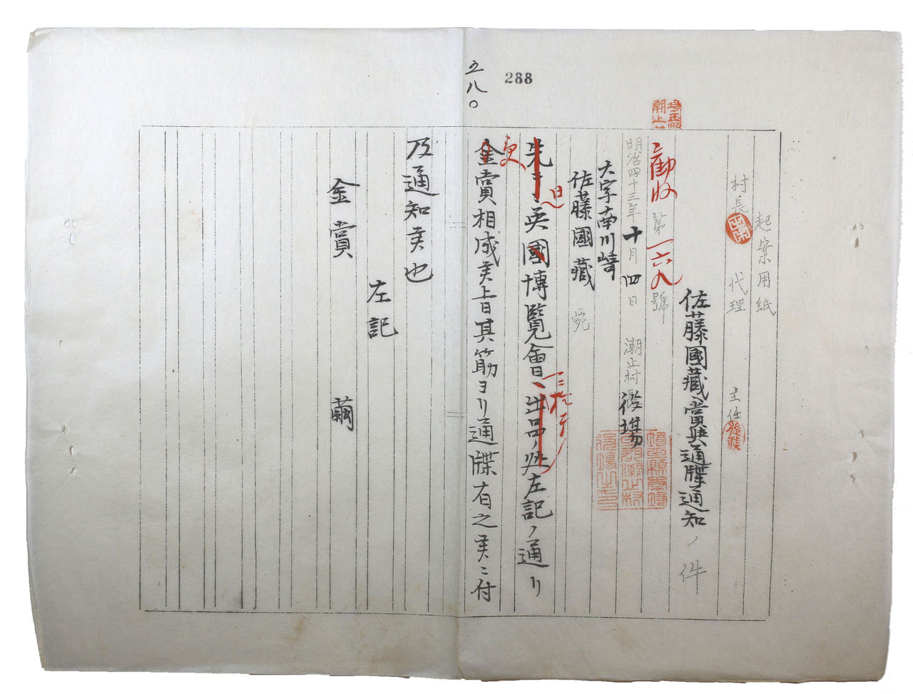 - タイトル:明治43年(1910年) 日英博覧会に出品した繭が金賞を受賞した佐藤国蔵へ通知