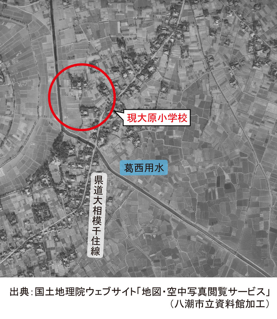 - 出典:国土地理院所蔵米軍撮影空中写真USA-M676-30(国土地理院ホームページ「地図・空中写真閲覧サービス」より転載)/八潮市立資料館加工