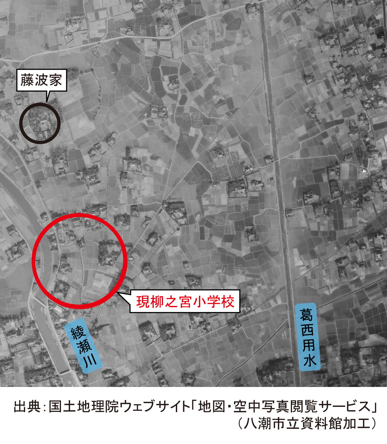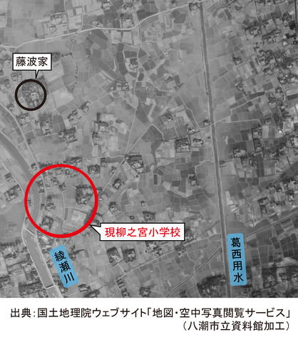 - 出典:国土地理院所蔵米軍撮影空中写真USA-M819-37・820-65(国土地理院ホームページ「地図・空中写真閲覧サービス」より転載)/八潮市立資料館加工