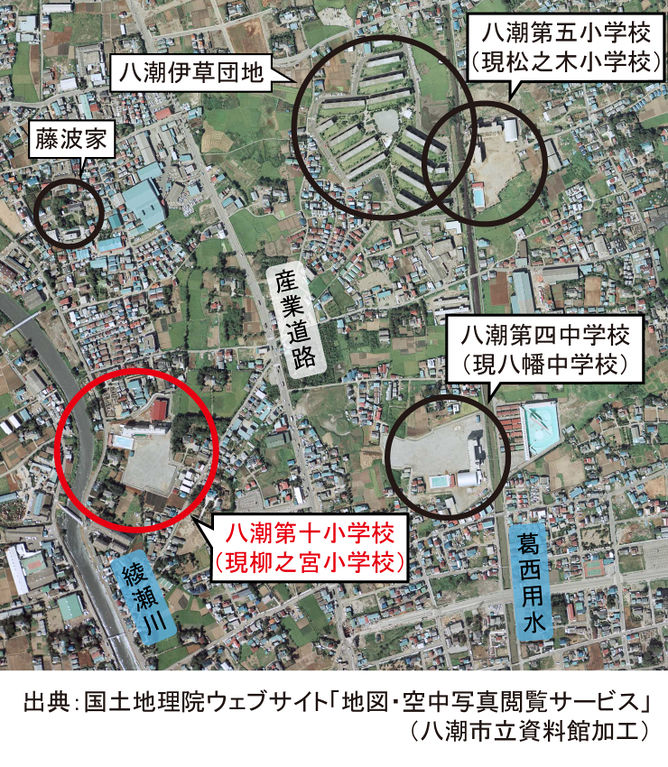 - 出典:国土地理院撮影空中写真CKT794-C1B-6(国土地理院ホームページ「地図・空中写真閲覧サービス」より転載)/八潮市立資料館加工