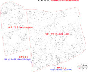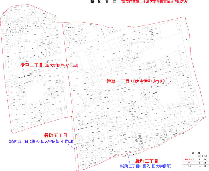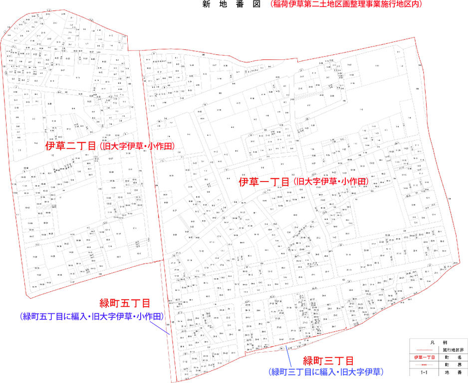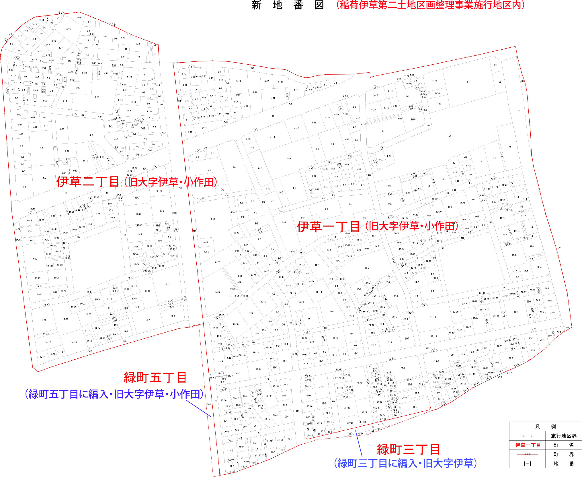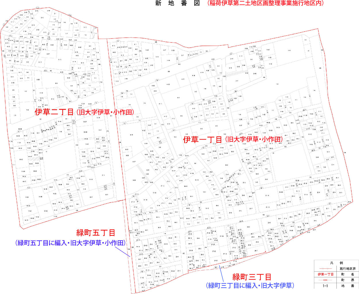 - タイトル:令和3年(2021年) 稲荷伊草第二土地区画整理事業施行地区の新地番図