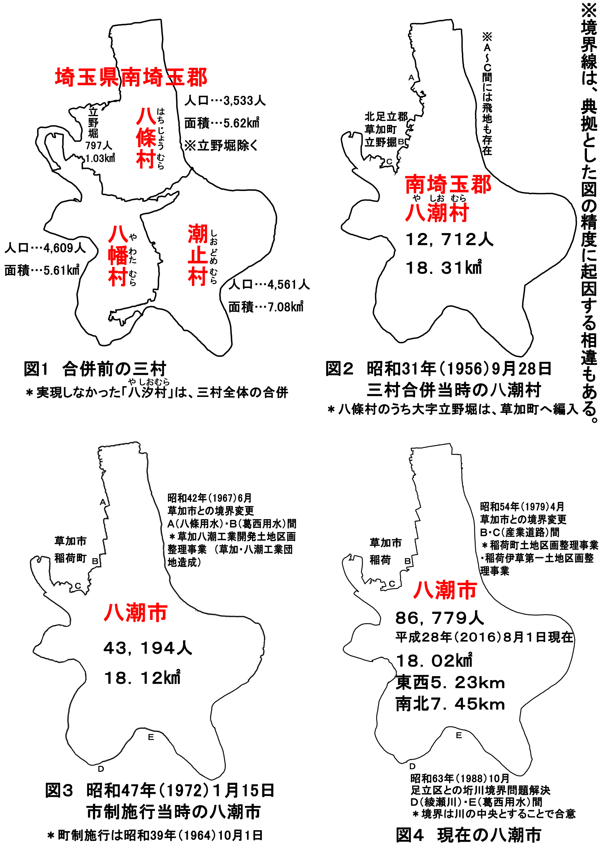 - 『れきナビ―やしお歴史事典』:旧版:八潮村の成立と境界変更(八潮市域確定)の図(20191210版)