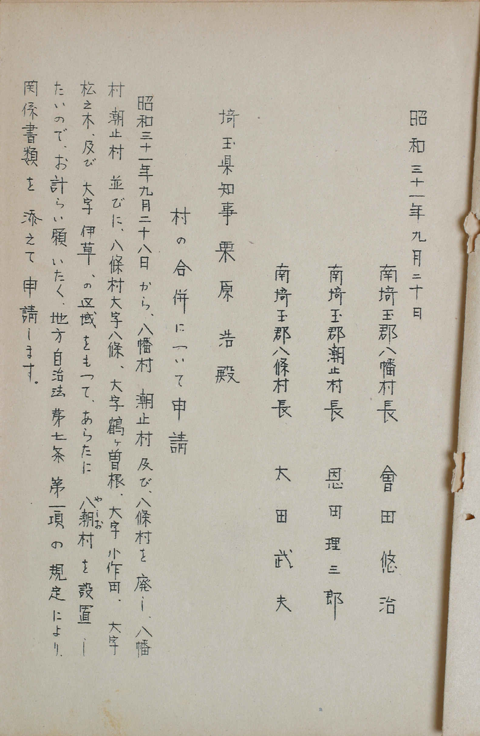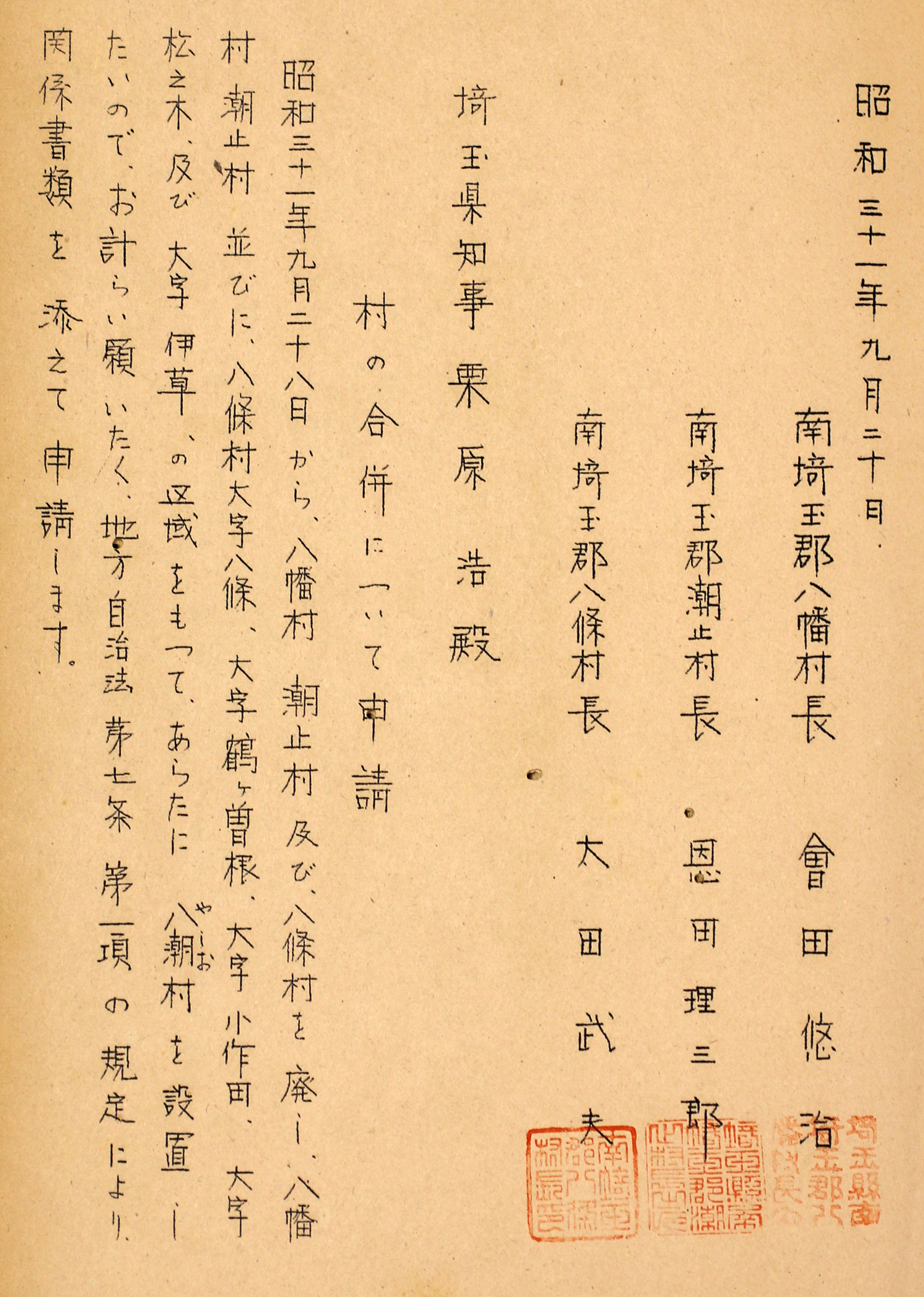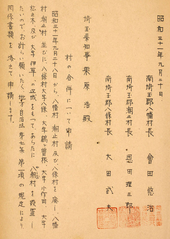 - タイトル:昭和31年(1956年)9月「八潮村設置申請書」