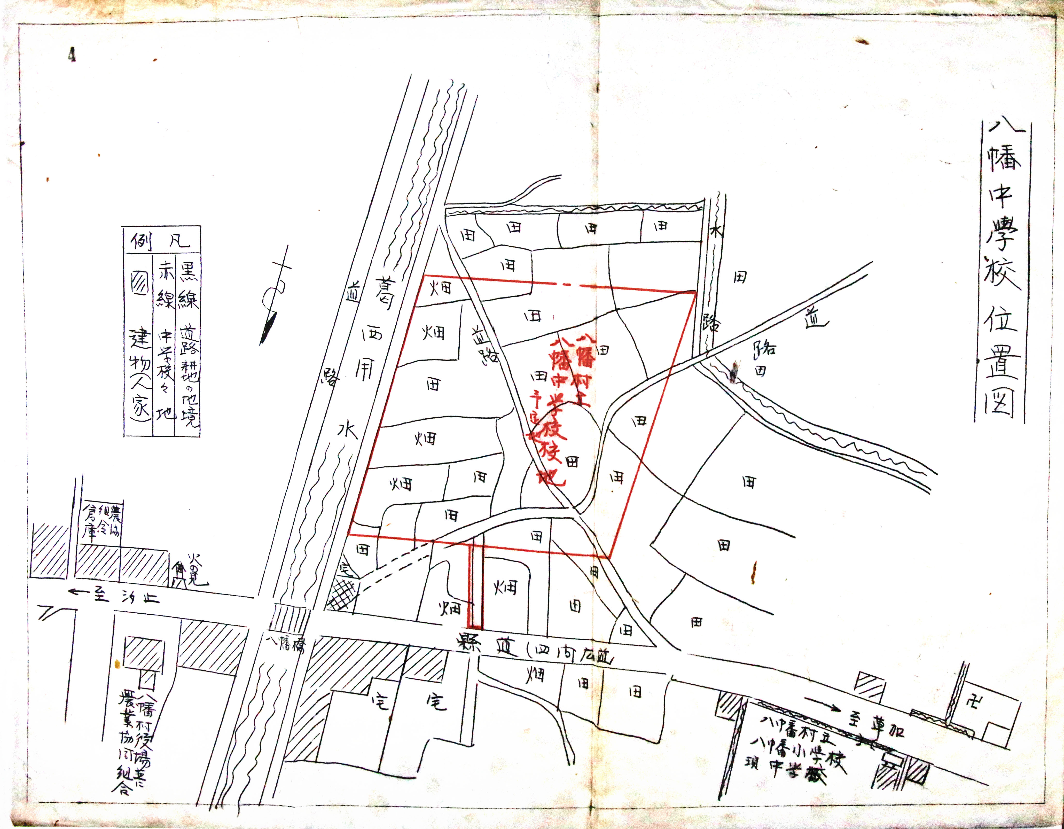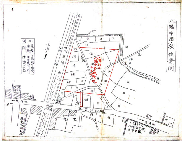 - タイトル:昭和23年(1948年)9月 八幡村立八幡中学校建設予定地位置図